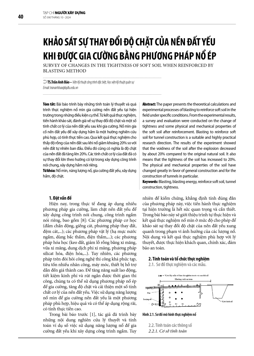 Bài báo trình bày những tính toán lý thuyết và quá trình thực nghiệm nổ mìn gia cường nền đất yếu tại hiện trường trong những điều kiện cụ thể. Từ kết quả thực nghiệm, tiến hành khảo sát, đánh giá về sự thay đổi độ chặt và một số tính chất cơ lý của nền đất yếu sau khi gia cường. Nổ mìn gia cố nền đất yếu để xây dựng hầm là một hướng nghiên cứu phù hợp, có tính thực tiễn cao. Qua kết quả thực nghiệm cho thấy độ rỗng của nền đất sau khi nổ giảm khoảng 20% so với nền đất tự nhiên ban đầu. Điều đó cũng có nghĩa là độ chặt của nền đất đã tăng lên 20%. Các tính chất cơ lý của đất đã có sự thay đổi lớn theo hướng có lợi trong xây dựng công trình nói chung, xây dựng hầm nói riêng.