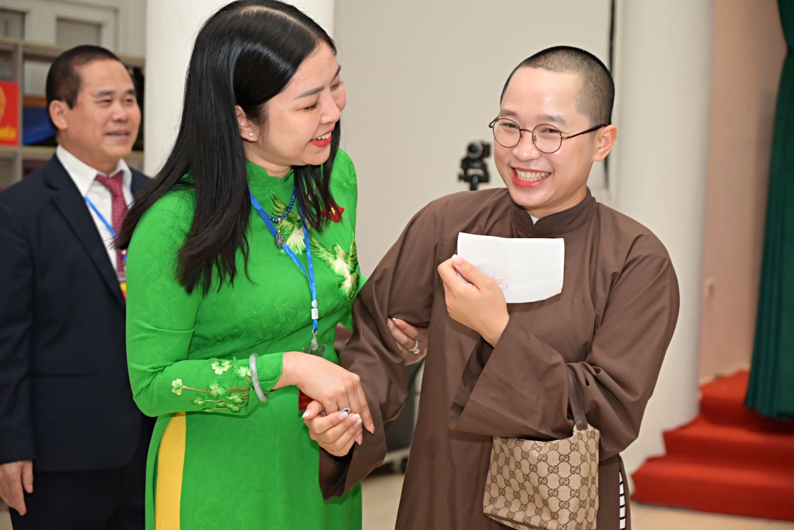 Bà Nguyễn Thị Hoài Thu trò chuyện và chúc mừng cử tri sư cô Phật giáo vừa thực hiện xong quyền bầu cử và trách nhiệm công dân của mình