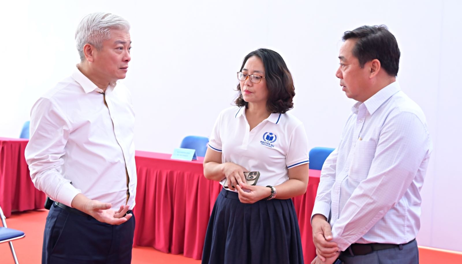Ông Mai Trọng Thái, Bí thư Đảng ủy, Chủ tịch Hội đồng nhân dân phường, Trưởng ban chỉ đạo, Chủ tịch Ủy ban bầu cử phường Đại Mỗ (ngoài cùng bên trái ảnh) và ông Nguyễn Chí Dũng – Phó Chủ tịch UBND phường Đại Mỗ trao đổi về công tác chuẩn bị bầu cử với lãnh đạo trường THCS Nguyễn Du - Khu vực bỏ phiếu số 10.