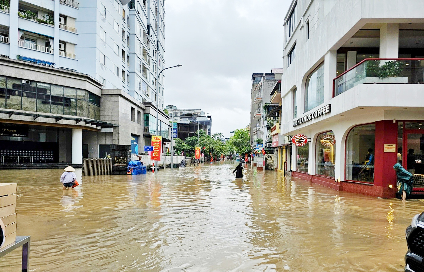 Ngập sâu tại khu vực trung tâm Hà Nội sau mưa lớn (10/2025), phản ánh hạ tầng thoát nước không đáp ứng kịp các trận mưa cực đoan. Ảnh: CP.