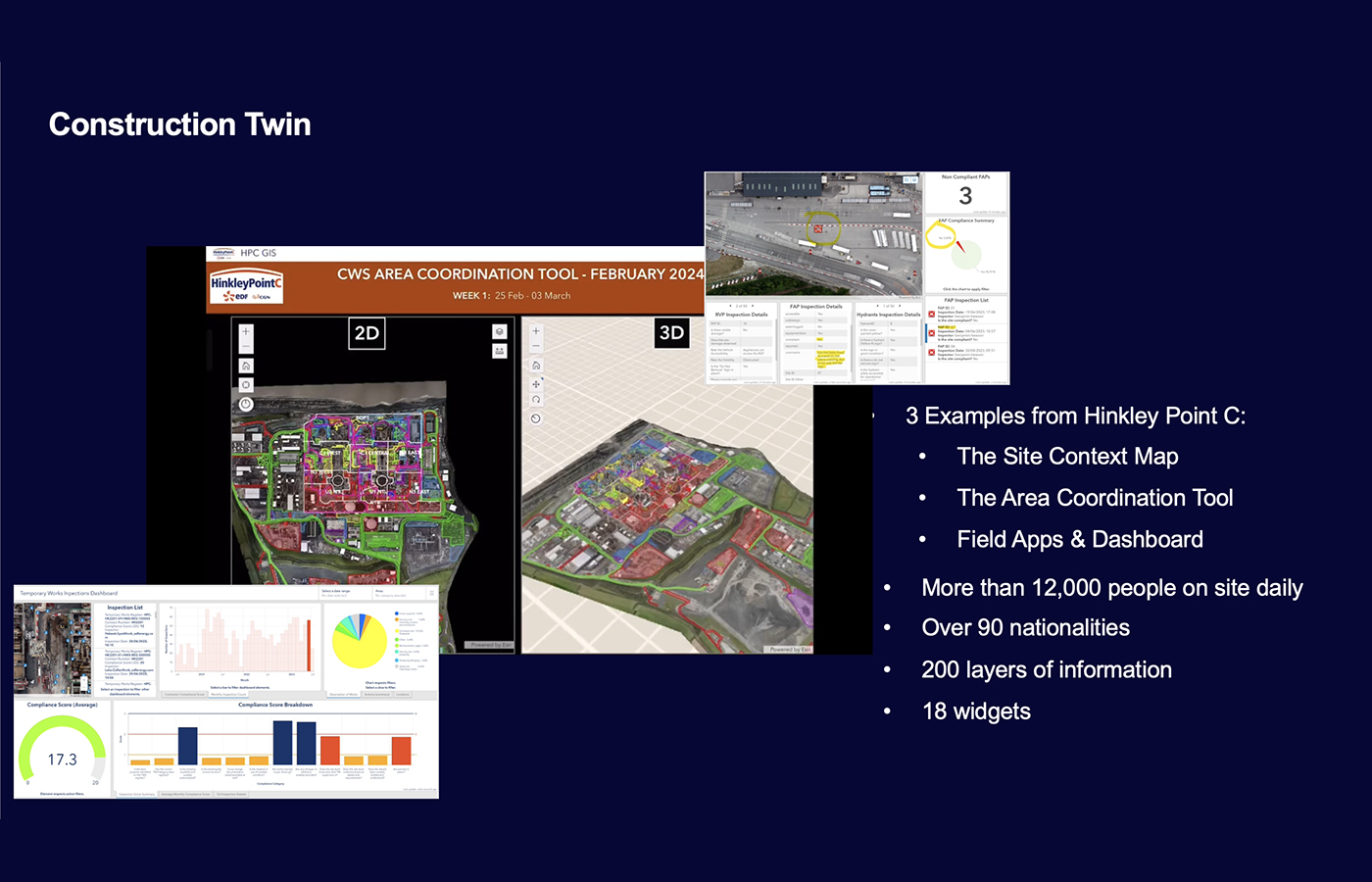 Mô hình Construction Twin tại dự án Hinkley Point C (Anh), tích hợp bản đồ hiện trường 2D-3D, công cụ điều phối khu vực, ứng dụng hiện trường và bảng điều khiển dữ liệu, cho phép quản lý đồng thời hàng nghìn lao động, hàng trăm lớp thông tin và toàn bộ hoạt động thi công trong môi trường số thống nhất.