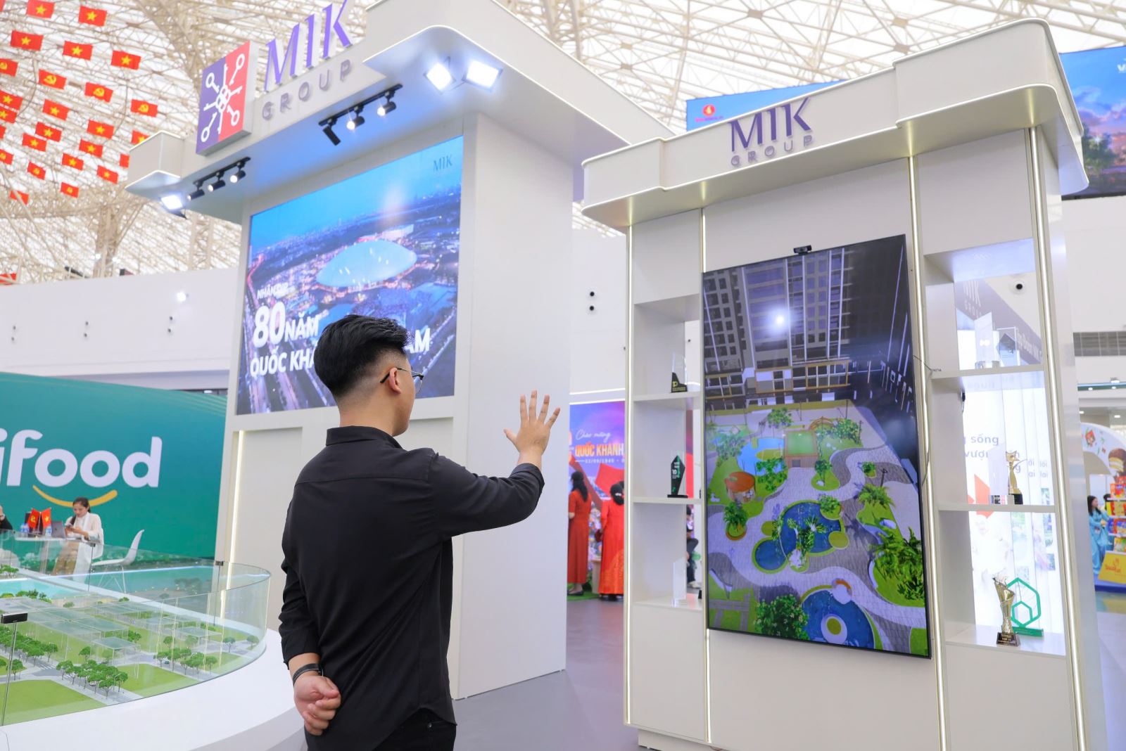 Ở trung tâm gian hàng, màn hình LED cong cỡ lớn liên tục trình chiếu TVC và hình ảnh về các dự án tiêu biểu của MIK Group. Hình ảnh sắc nét kết hợp âm thanh sống động tạo nên hiệu ứng thị giác – thính giác cuốn hút, khẳng định vị thế thương hiệu bất động sản cao cấp của Tập đoàn.