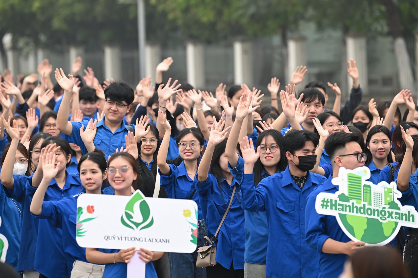 Tại điểm cầu Hà Nội, từ sân khấu chính lễ ra quân tại Trung tâm Văn hóa - Thông tin và thể thao phường Phú Diễn đến các điểm cầu như Đại học Bách khoa Hà Nội, trường Đại học Văn hóa Hà Nội, Ký túc xá Đại học Quốc gia Hà Nội (Hòa Lạc và Mễ Trì)… các trung tâm thương mại Vincom, đông đảo thanh niên, người dân hào hứng tham gia ngày hội Hành động Xanh. Trong ảnh: Ông Tạ Hồng Sơn (giữa) - Bí thư Đoàn Thanh niên Bộ Nông nghiệp & Môi trường cùng các lãnh đạo Phường Phú Diễn và hơn 500 thanh niên tham gia hưởng ứng buổi ra quân.