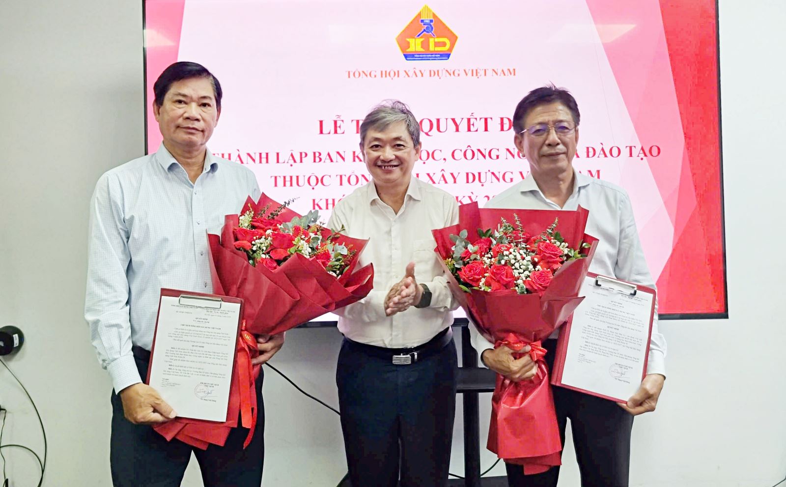 TS. Đặng Việt Dũng – Chủ tịch Tổng hội Xây dựng Việt Nam (đứng giữa) trao quyết định thành lập, quyết định bổ nhiệm và tặng hoa chúc mừng PGS.TS Phạm Duy Hòa và TS. Trần Bá Việt