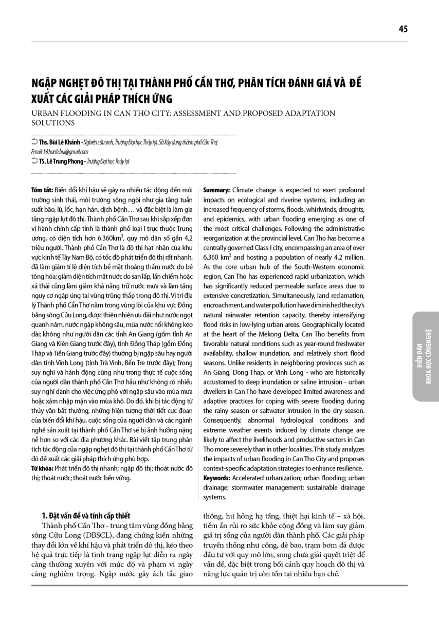 - Ths. Bùi Lê Khánh - Nghiên cứu sinh, Trường Đại học Thủy lợi, Sở Xây dựng thành phố Cần Thơ, Email: lekhanh.bui@gmail.com