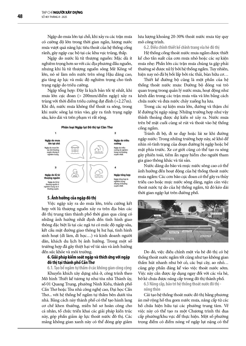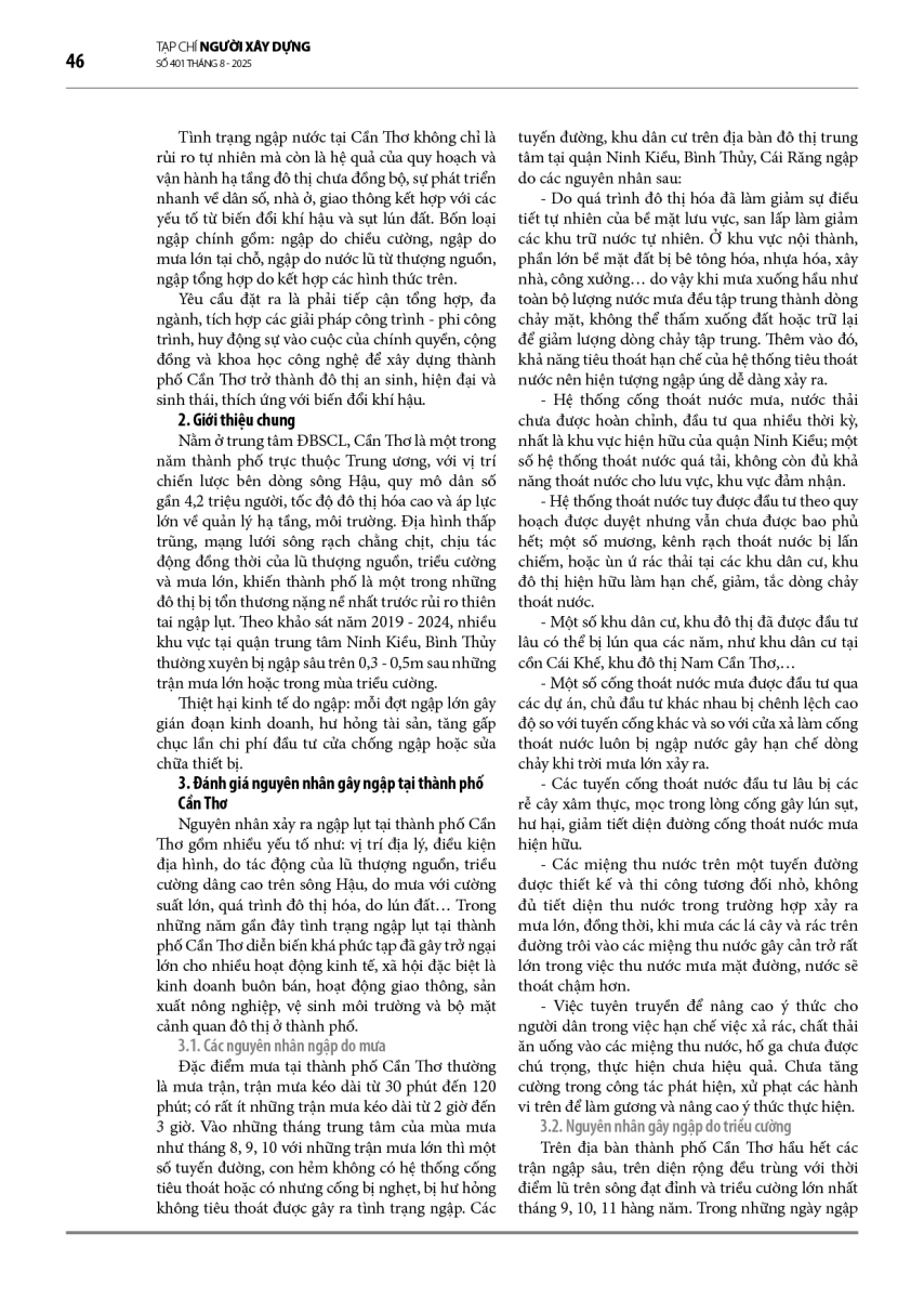 Biến đổi khí hậu sẽ gây ra nhiều tác động đến môi trường sinh thái, môi trường sông ngòi như gia tăng tuần suất bão, lũ, lốc, hạn hán, dịch bệnh… và đặc biệt là làm gia tăng ngập lụt đô thị. Thành phố Cần Thơ sau khi sắp xếp đơn vị hành chính cấp tỉnh là thành phố loại I trực thuộc Trung ương, có diện tích hơn 6.360km2, quy mô dân số gần 4,2 triệu người. Thành phố Cần Thơ là đô thị hạt nhân của khu vực kinh tế Tây Nam Bộ, có tốc độ phát triển đô thị rất nhanh, đã làm giảm tỉ lệ diện tích bề mặt thoáng thấm nước do bê tông hóa; giảm diện tích mặt nước do san lấp, lấn chiếm hoặc xả thải cũng làm giảm khả năng trữ nước mưa và làm tăng nguy cơ ngập úng tại vùng trũng thấp trong đô thị. Vị trí địa lý Thành phố Cẩn Thơ nằm trong vùng lõi của khu vực Đồng bằng sông Cửu Long, được thiên nhiên ưu đãi như: nước ngọt quanh năm, nước ngập không sâu, mùa nước nổi không kéo dài; không như người dân các tỉnh An Giang (gồm tỉnh An Giang và Kiên Giang trước đây), tỉnh Đồng Tháp (gồm Đồng Tháp và Tiền Giang trước đây) thường bị ngập sâu hay người dân tỉnh Vĩnh Long (tỉnh Trà Vinh, Bến Tre trước đây); Trong suy nghĩ và hành động cũng như trong thực tế cuộc sống của người dân thành phố Cần Thơ hầu như không có nhiều suy nghĩ dành cho việc ứng phó với ngập sâu vào mùa mưa hoặc xâm nhập mặn vào mùa khô. Do đó, khi bị tác động từ thủy văn bất thường, những hiện tượng thời tiết cực đoan của biến đổi khí hậu, cuộc sống của người dân và các ngành nghề sản xuất tại thành phố Cần Thơ sẽ bị ảnh hưởng nặng nề hơn so với các địa phương khác. Bài viết tập trung phân tích tác động của ngập nghẹt đô thị tại thành phố Cần Thơ từ đó đề xuất các giải pháp thích ứng phù hợp.