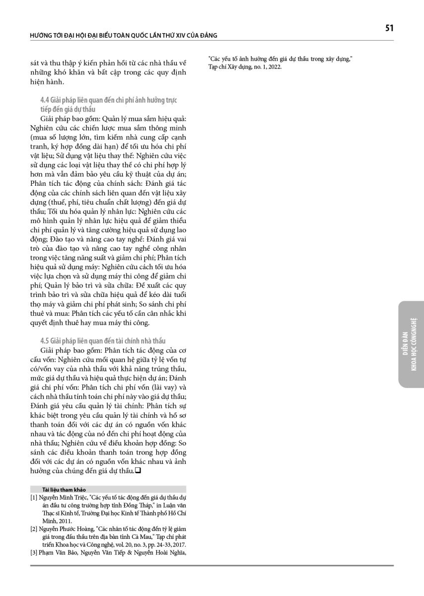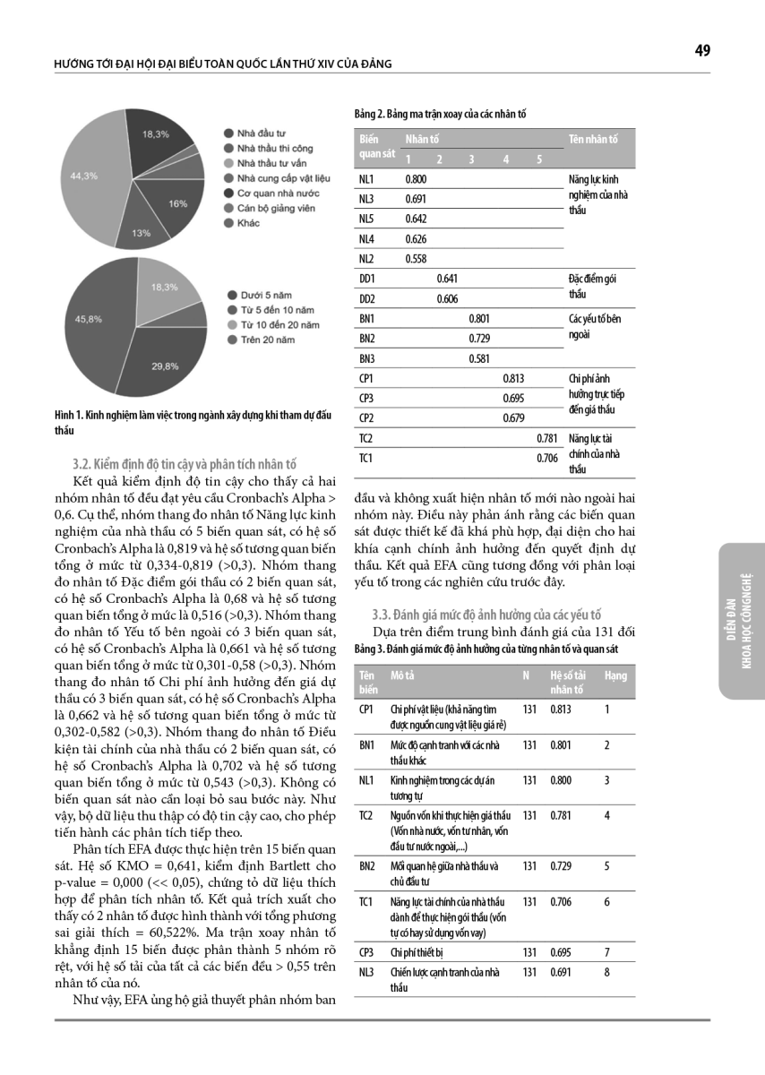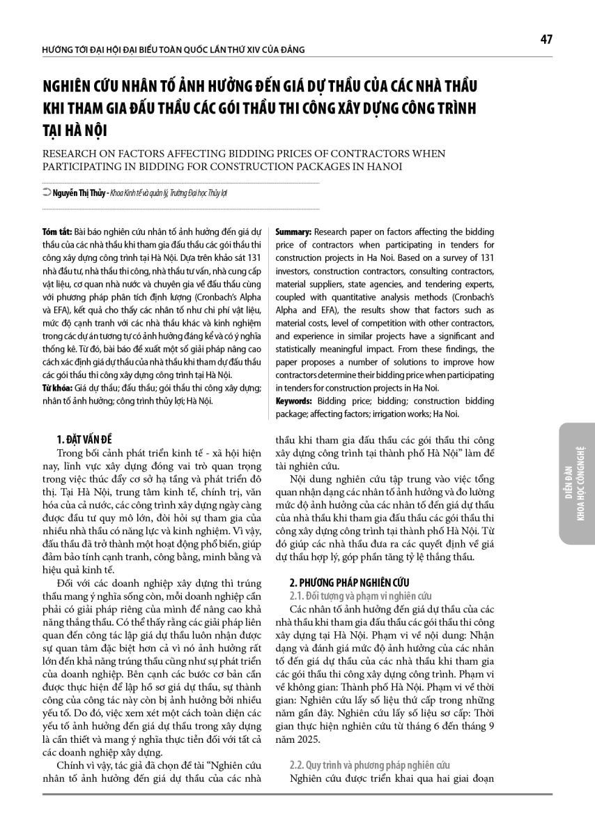 Bài báo nghiên cứu nhân tố ảnh hưởng đến giá dự thầu của các nhà thầu khi tham gia đấu thầu các gói thầu thi công xây dựng công trình tại Hà Nội. Dựa trên khảo sát 131 nhà đầu tư, nhà thầu thi công, nhà thầu tư vấn, nhà cung cấp vật liệu, cơ quan nhà nước và chuyên gia về đấu thầu cùng với phương pháp phân tích định lượng (Cronbach’s Alpha và EFA), kết quả cho thấy các nhân tố như chi phí vật liệu, mức độ cạnh tranh với các nhà thầu khác và kinh nghiệm trong các dự án tương tự có ảnh hưởng đáng kể và có ý nghĩa thống kê. Từ đó, bài báo đề xuất một số giải pháp nâng cao cách xác định giá dự thầu của nhà thầu khi tham dự đấu thầu các gói thầu thi công xây dựng công trình tại Hà Nội.