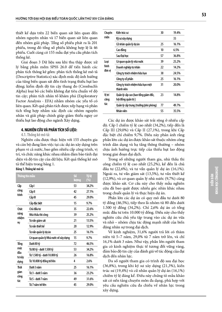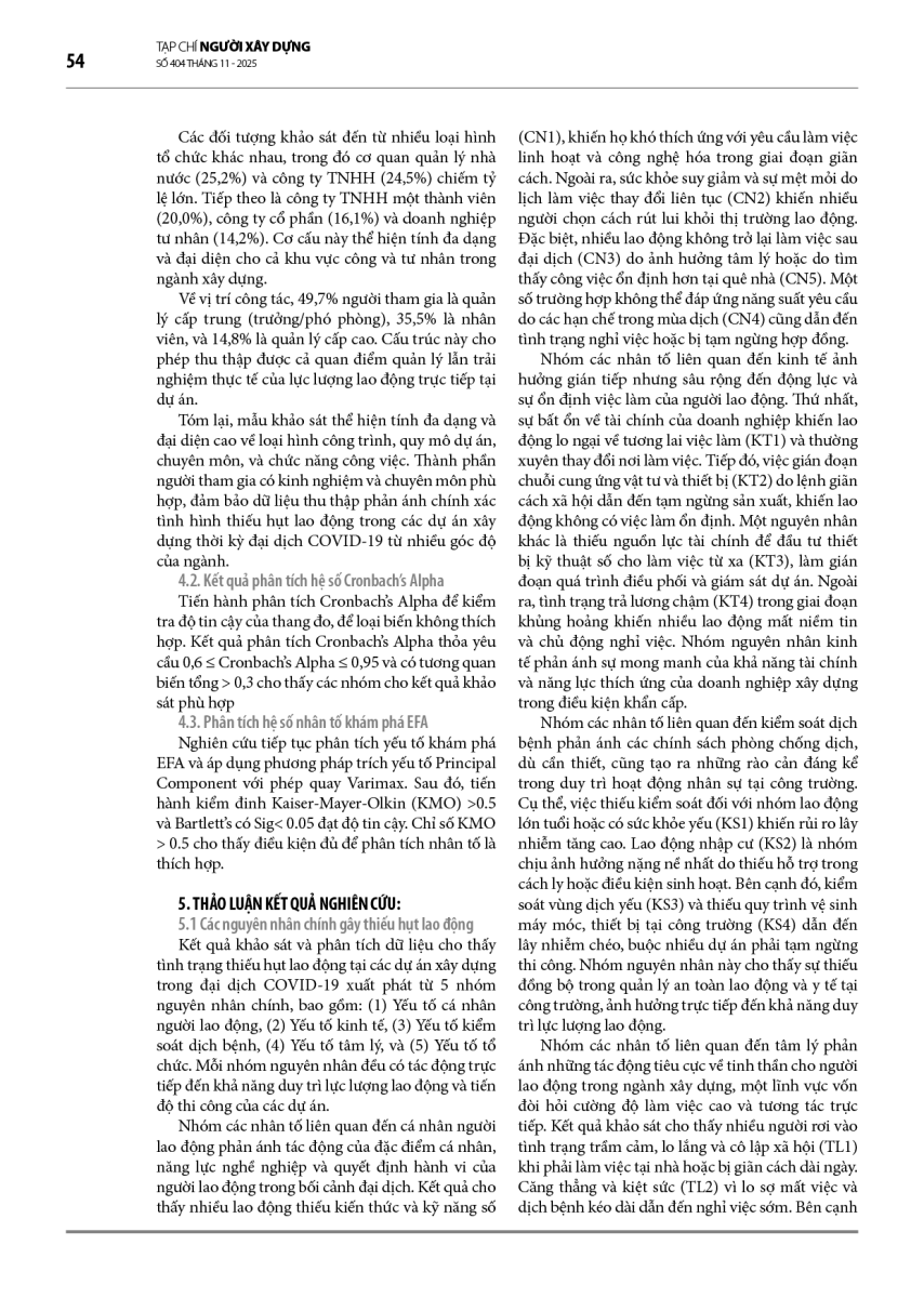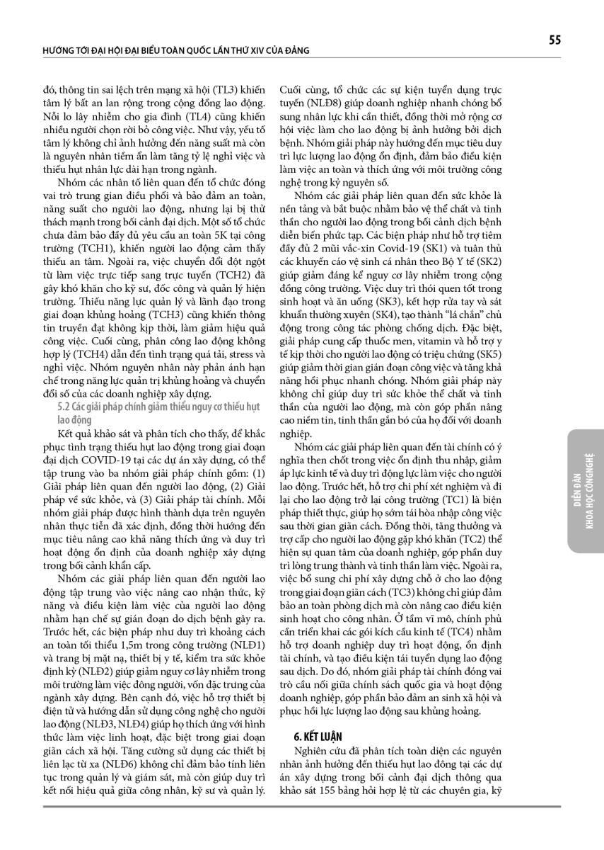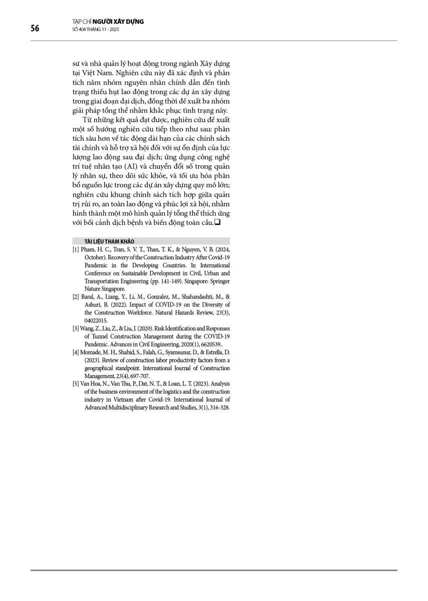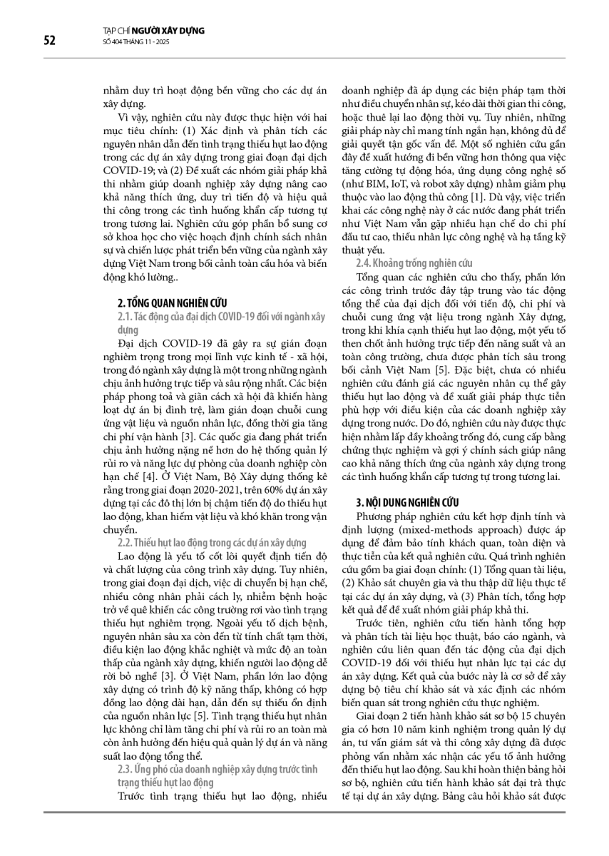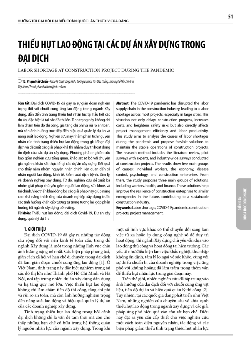 Đại dịch COVID-19 đã gây ra sự gián đoạn nghiêm trọng đối với chuỗi cung ứng lao động trong ngành Xây dựng, dẫn đến tình trạng thiếu hụt nhân lực tại hầu hết các dự án, đặc biệt là tại các đô thị lớn. Tình trạng này không chỉ làm chậm tiến độ thi công, gia tăng chi phí và rủi ro an toàn, mà còn ảnh hưởng trực tiếp đến hiệu quả quản lý dự án và năng suất lao động. Nghiên cứu này nhằm phân tích nguyên nhân của tình trạng thiếu hụt lao động trong giai đoạn đại dịch và đề xuất các giải pháp khả thi nhằm duy trì hoạt động ổn định của các dự án xây dựng. Phương pháp nghiên cứu bao gồm nghiên cứu tổng quan, khảo sát sơ bộ với chuyên gia ngành, khảo sát thực tế tại các dự án xây dựng. Kết quả cho thấy năm nhóm nguyên nhân chính liên quan đến cá nhân người lao động, kinh tế, kiểm soát dịch bệnh, tâm lý, và doanh nghiệp xây dựng. Từ đó, nghiên cứu đề xuất ba nhóm giải pháp chủ yếu gồm người lao động, sức khoẻ, và tài chính. Việc triển khai đồng bộ các giải pháp này giúp nâng cao khả năng thích ứng của doanh nghiệp xây dựng trước các tình huống khẩn cấp tương tự trong tương lai, góp phần hướng tới ngành xây dựng bền vững.