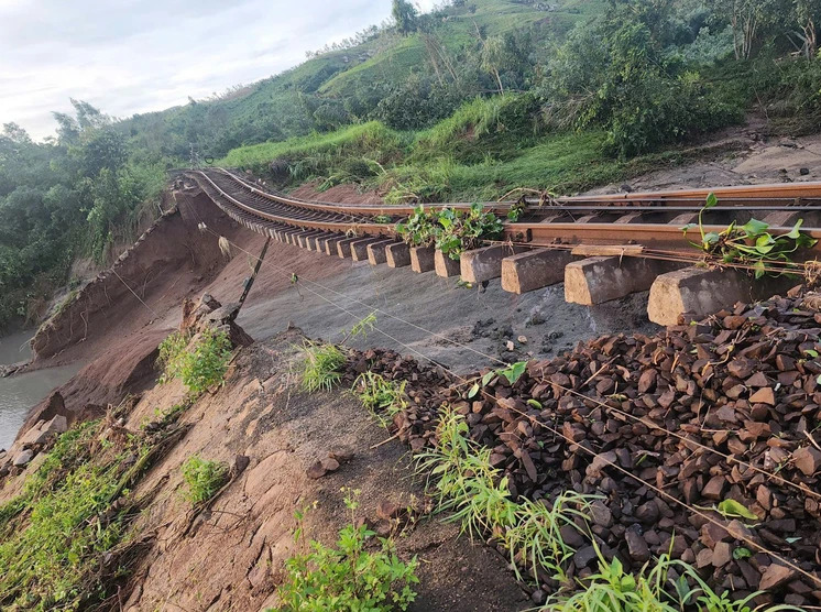 Đường sắt Bắc - Nam đoạn qua tỉnh Đắk Lắk bị xói lở do nước lũ từ bão số 13 (Kalmaegi). Ảnh: chinhphu.vn