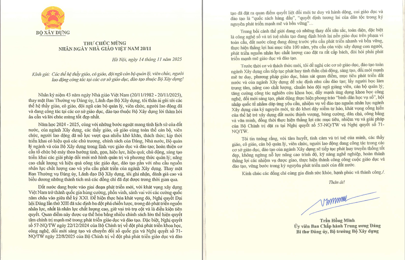 Nhân kỷ niệm 43 năm Ngày Nhà giáo Việt Nam (20/11/1982 - 20/11/2025), Bộ trưởng Bộ Xây dựng đã gửi Thư chúc mừng tới các thế hệ thầy giáo, cô giáo, cán bộ quản lý, viên chức và người lao động đang công tác trong hệ thống các cơ sở đào tạo trực thuộc Bộ.