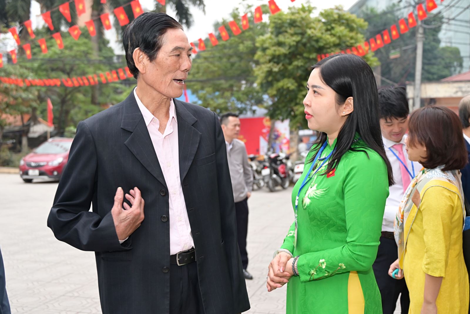 Bà Nguyễn Thị Hoài Thu, Phó bí thư Thường trực Đảng ủy, Phó trưởng Ban chỉ đạo công tác bầu cử phường Đại Mỗ trò chuyện với cử tri đồng bào Công giáo
