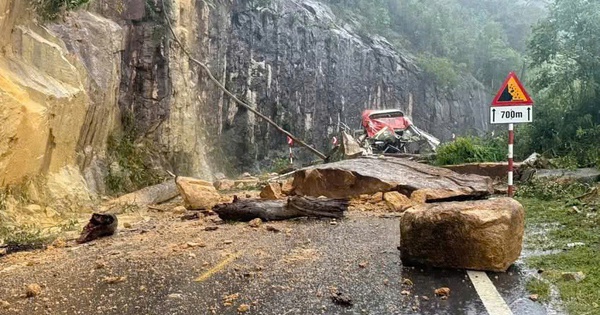 Hiện trường sạt lở nghiêm trọng tại đèo Khánh Lê, tỉnh Khánh Hòa với đất đá, cây cối đổ xuống chắn ngang đường.