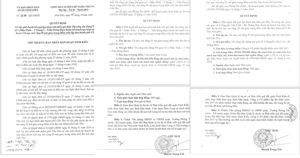 Ngày 15/11/2024, ông Huỳnh Trung Tứ, Chủ tịch UBND quận Ninh Kiều (TP. Cần Thơ) ký Quyết định số 5644/QĐ-UBND phê duyệt cho Liên danh Nam Long (Công ty TNHH MTV thương mại - dịch vụ - xây dựng Cửu Long - Công ty CP Đầu tư xây lắp Miền Nam) trúng gói thầu “Nút giao số 1 (Mậu Thân - 3 Tháng 2 - Trần Hưng Đạo), phường Ninh Kiều” với giá trúng thầu là 38.596.564.000 đồng, tiết kiệm 1%, thời gian thi công 360 ngày. Gói thầu cũng không có sự cạnh tranh khi chỉ có mình Liên danh Nam Long tham gia và được phê duyệt trúng thầu.