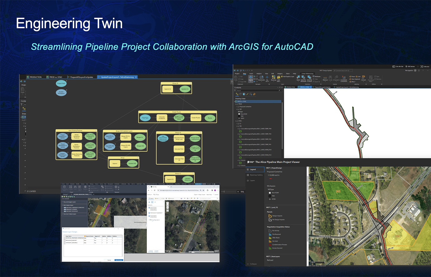 Mô hình Engineering Twin cho dự án hạ tầng tuyến ống, tích hợp dữ liệu thiết kế AutoCAD với nền tảng ArcGIS, cho phép kết nối bản vẽ kỹ thuật, dữ liệu không gian và hiện trạng thực địa trong một môi trường thống nhất, hỗ trợ phối hợp thiết kế, thi công và quản lý dự án hiệu quả.
