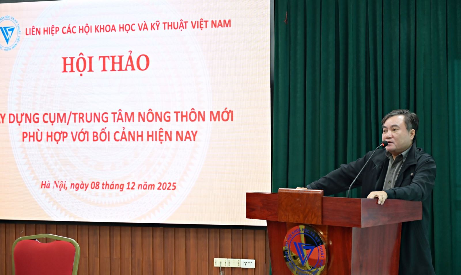 Phát biểu khai mạc hội thảo, PGS.TS Phạm Quang Thao, Phó Chủ tịch VUSTA nhấn mạnh, xây dựng cụm trung tâm nông thôn mới đang trở thành yêu cầu cấp thiết trong bối cảnh nông thôn Việt Nam đối mặt nhiều thách thức mới. Quá trình đô thị hóa diễn ra mạnh mẽ, biến đổi khí hậu ngày càng khốc liệt, chuyển dịch lao động, dân cư diễn ra nhanh, trong khi hạ tầng xã hội, dịch vụ công và liên kết sản xuất ở nhiều địa phương chưa theo kịp. Do đó, mô hình nông thôn mới không thể dừng lại ở tiêu chí xây dựng đơn lẻ từng xã mà cần tiếp cận theo cụm, liên hoàn, có tính kết nối vùng để nâng cao hiệu quả đầu tư, tối ưu hóa nguồn lực và tạo động lực phát triển bền vững.