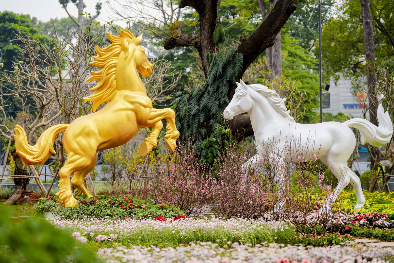 Tiểu cảnh Song Mã đón xuân cùng gần 30.000 cây trái, chậu hoa được trang trí tại công viên để mừng Tết Bính Ngọ 2026